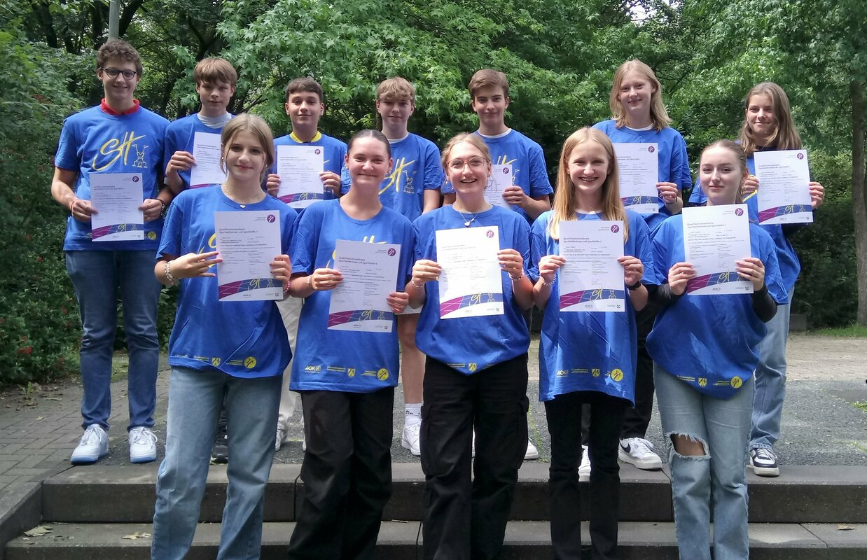 Nach ihrer erfolgreich abgeschlossenen Ausbildung haben dreizehn Sporthelferinnen und Sporthelfer ihre Urkunden in Empfang genommen. Inhalte des Lehrgangs, der in Kooperation mit dem Kreissportbund durchgeführt wird, waren verschiedene Aspekte der Spiel- und Sportpraxis außerhalb des Sportunterrichts, die Planung und Durchführung von Sportangeboten sowie die Persönlichkeitsentwicklung in sportlichen Zusammenhängen.