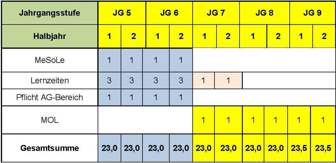 Alle Schulstunden und auch die Mittagspause haben für die GanztagsschülerInnen eine Länge von 67,5 Minuten. Diese Verlängerung der Stunden führte zum einen zu einer Entschleunigung des Tages, da die GanztagsschülerInnen maximal fünf unterschiedliche Fächer pro Tag haben. Zudem hat die Umstellung die Übungsmöglichkeiten und Lernchancen verbessert, und kooperatives Lernen ist sehr viel besser als vorher möglich.