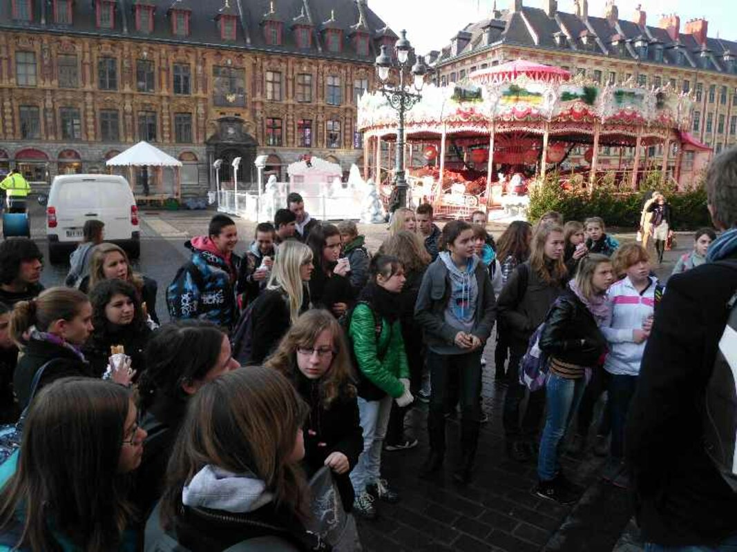 Am Morgen sind wir mit dem Bus nach Lille aufgebrochen. Manche Schüler hatten vor der Abfahrt noch eine Stunde Unterricht, andere hatten die erste Sunde frei. In Lille angekommen, haben wir zunächst eine Stadtralley gemacht, die eine der beiden französischen Lehrerinnen vorbereitet hatte. Die Ralley war klasse. Sie war als Sternralley organisiert. In Gruppen von 4 bis 5 Schülern (natürlich deutsch-französische Gruppen!) bekamen wir immer eine Frage oder einen Auftrag, den wir erledigen mussten, sind dann zu den Lehrern zurückgegangen und haben uns den nächsten Auftrag abgeholt. Wir mussten Passanten ansprechen und sie bitten, Lieder zu singen, mussten anhand von Fotos bestimmte Orte wiederfinden etc.